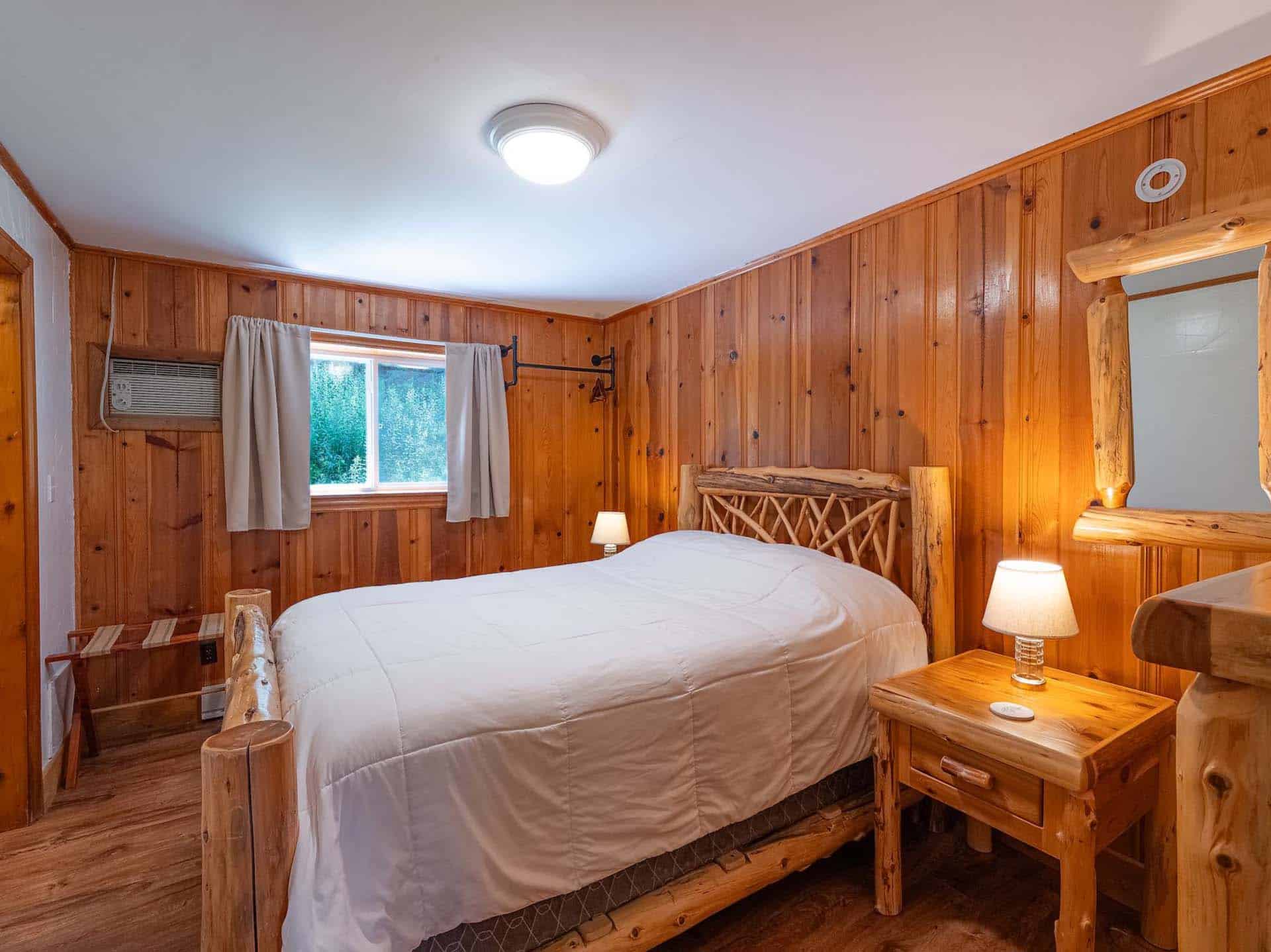 The Tamarack bedroom features 1 queen hand peeled cedar twig bed. The room is artfully decorated with photographs highlighting the Tamarack.