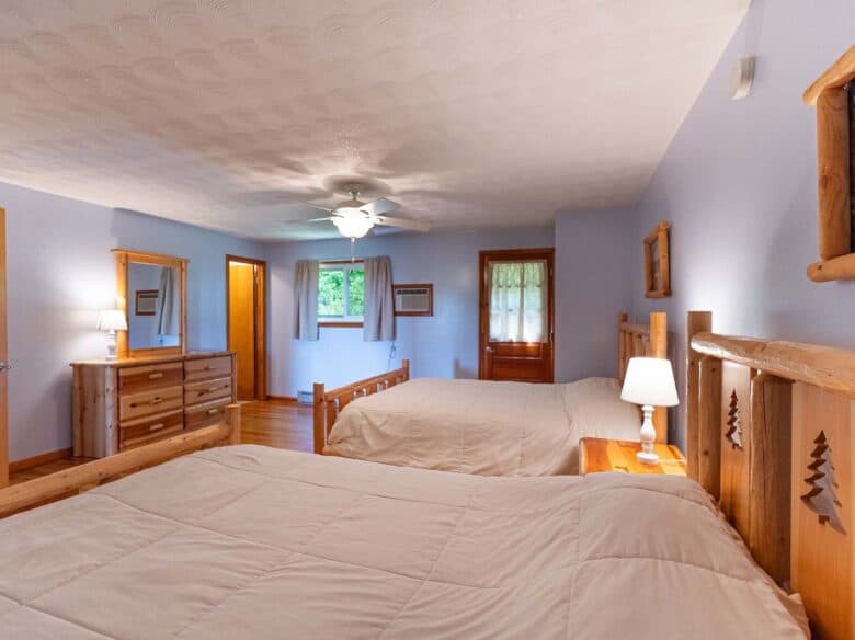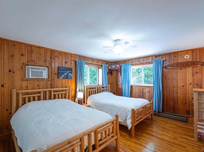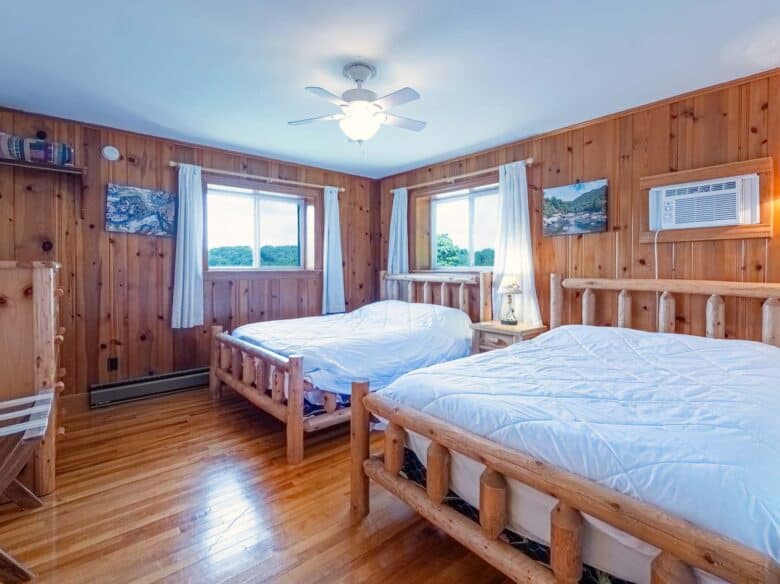 The Gauley River bedroom features 2 full peeled white cedar log beds. The room is artfully decorated with photographs showcasing the natural beauty of the Gauley River.